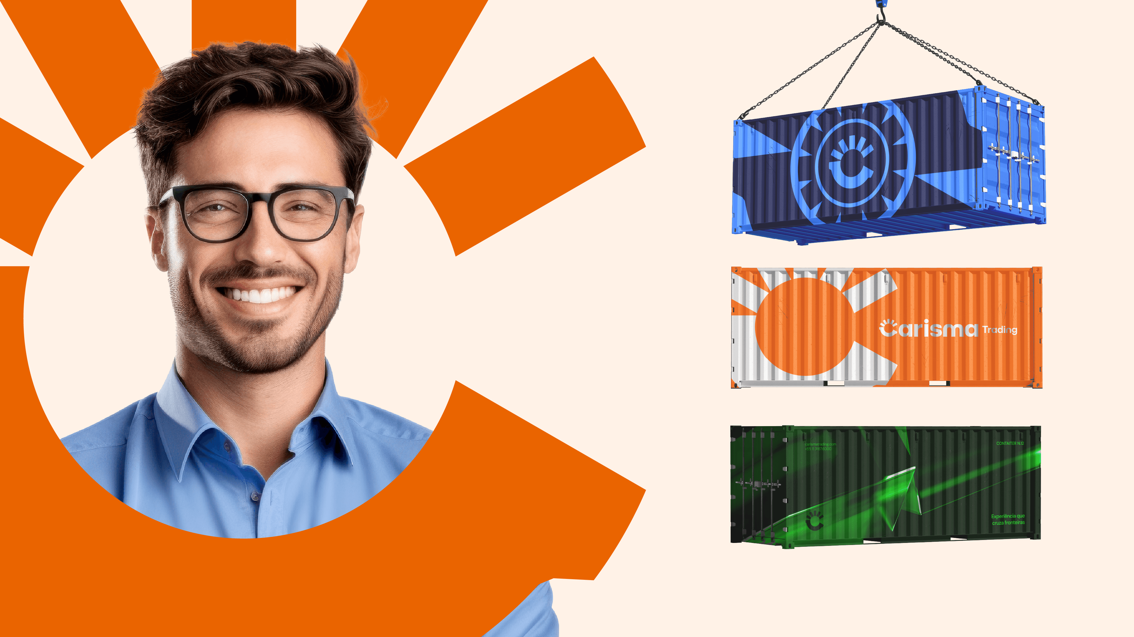 O grande desafio do projeto de identidade visual era desenvolver uma linguagem gráfica que expressasse o universo da Carisma como uma empresa moderna e profissional, unindo inteligência logística a uma abordagem descomplicada e próxima do cliente. Era fundamental encontrar o equilíbrio perfeito para refletir a leveza de uma marca amigável sem abrir mão da sofisticação visual e do rigor técnico exigidos pelo seu setor de atuação. A solução visual materializou-se em um logotipo com tipografia sólida que ganha força no desenho exclusivo da letra "C", concebido para atuar como símbolo central. Essa inicial estilizada carrega múltiplos significados da essência da empresa: a sua base curva remete a um sorriso acolhedor, enquanto a parte superior evoca a estrutura geométrica de containers, conectando a marca diretamente ao universo logístico. A paleta de cores foi desenvolvida para honrar o legado da marca mantendo os tradicionais azul e verde, mas introduzindo a energia de um laranja vibrante e a leveza de um tom claro como base. Mais do que uma escolha estética, a paleta atua de forma funcional como um sistema de codificação visual para os seis setores específicos atendidos pela empresa (Alimentício, Ferroviário, Químico, Automotivo, Vestuário e Eletrônico). Para coroar essa clareza, a tipografia escolhida foi a DM Sans, que com suas formas arredondadas equilibra a informalidade e a seriedade, garantindo uma comunicação acessível e profissional.